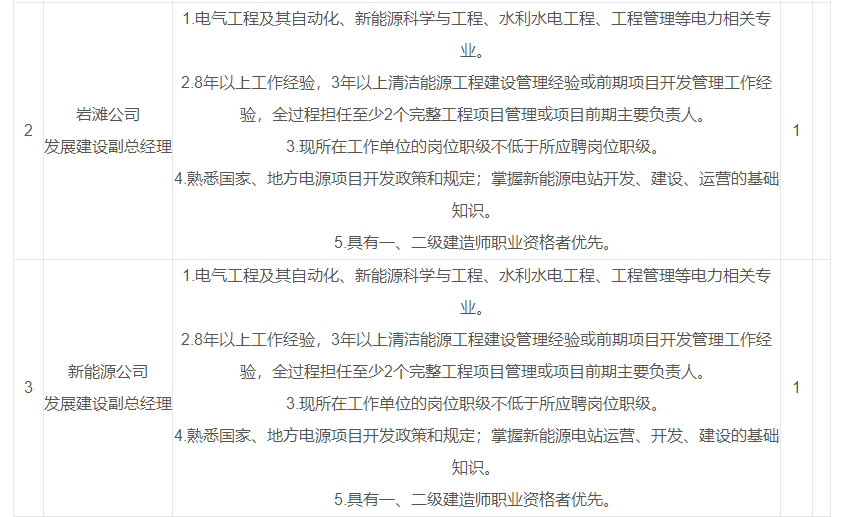 新能源公司发展建设副总经理1人(集团公司总部处室副经理级)。
