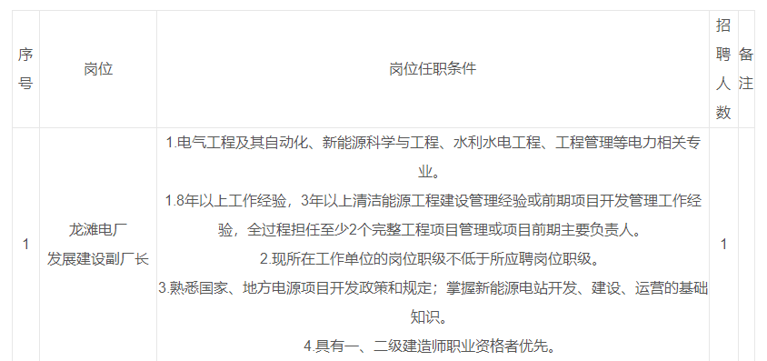 龙滩电厂发展建设副厂长1人(集团公司总部处室副经理级)。