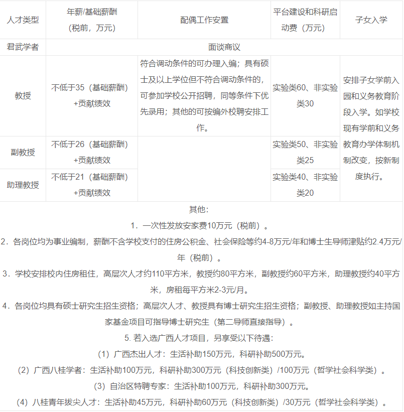 随着我国“十四五”开启全面建设社会主义现代化国家新征程,教育部和广西壮族自治区党委、政府更加高度重视广西大学的建设改革发展,提供了系列政策支持和资金项目支持,学校进入了多重发展机遇叠加期和跨越发展的快车道,力争建校百年时建成特色鲜明的国内一流综合性研究型大学。我们比以往任何时候更加渴望优秀学者加盟,我们极力创造适应青年人才脱颖而出的学术生态和条件保障,提供比较优越的薪酬待遇,为所有引进人才提供国家事业编制,为君武学者、教授安排配偶工作,为所有引进人才的子女提供一流的基础教育,为所有引进人才提供租住房。