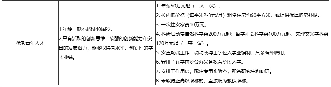 (5)E层次人才:生活补助每年10万元,连续发放3年;一次性购房补助50万元;科研补助每年自然科学类15万元、哲学社会科学类8万元,连续补助3年。