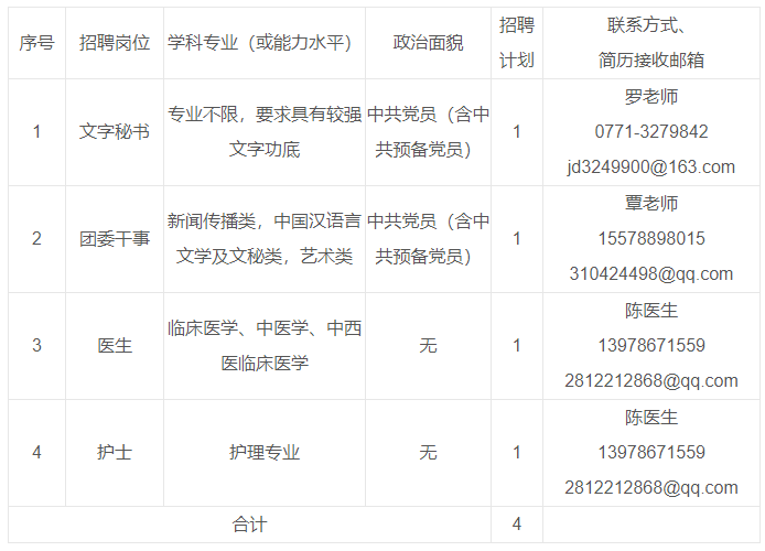 1.文字秘书、团委干事、医生学历学位要求为硕士研究生及以上;护士要求本科学士学位及以上。