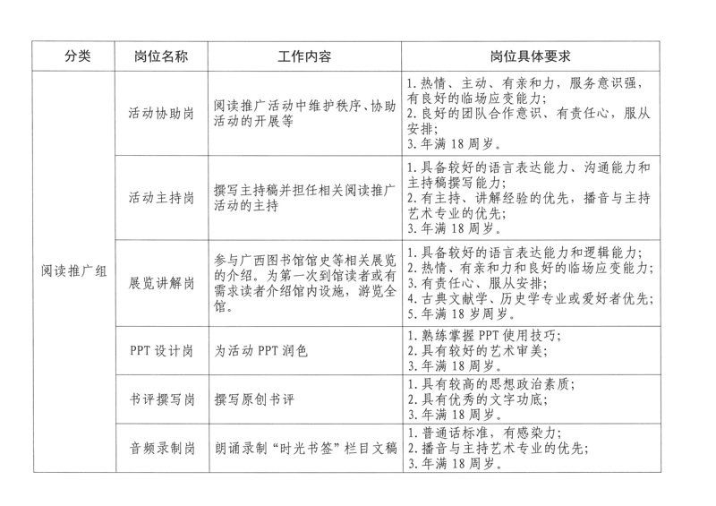 (一)除阅览室服务岗固定安排服务时间,其他岗位均根据实际工作需要灵活安排,志愿者可在“桂志愿”官方网站上搜索“广西壮族自治区图书馆”查找我馆的相关招募信息或加入广西壮族自治区图书馆“阿图籽”文化和旅游志愿者群(QQ群:921285906),了解相关招募信息。